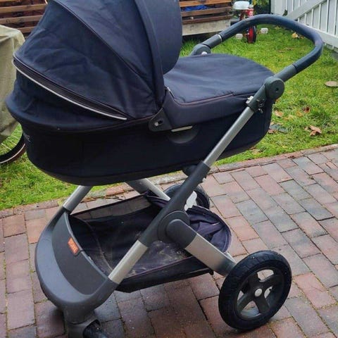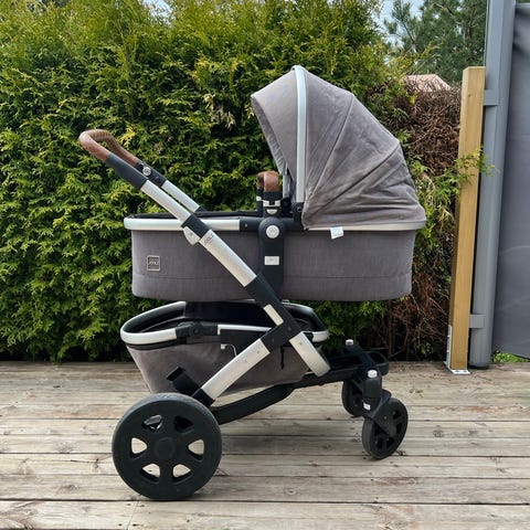 Pent brukt tynn vognpose. Bambusviskose/polyes ter utvendig og 100% bomull innvendig. Kan brettes ut og brukes som teppe. Fast forlengerdel i bunn.