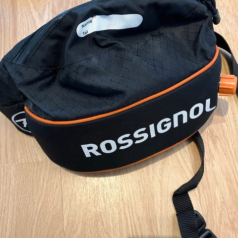 Rossignol skibelte for barn med justerbart belte og polstret midtdel. Beltet har svart og hvit farge med grafiske detaljer i blått og gult. Designet for å holde skistøvler sammen og sikre bedre kontroll under bruk.