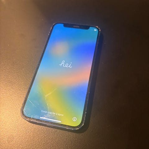 Apple iPhone 12 med 128 GB lagringskapasitet i blå farge. Telefonen har en 6,1 tommers OLED-skjerm, dobbeltkamera på baksiden og aluminiumsramme. Modell med Face ID og iOS operativsystem.