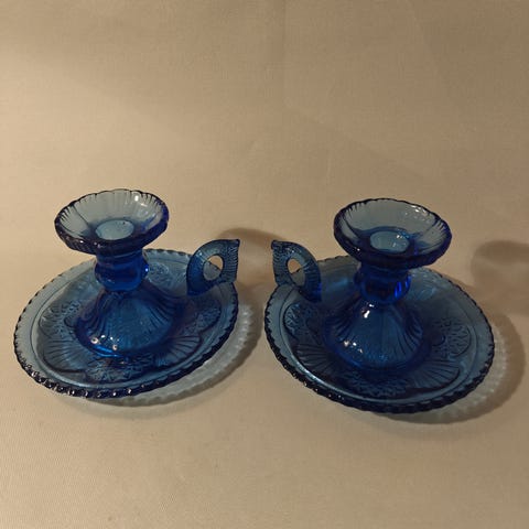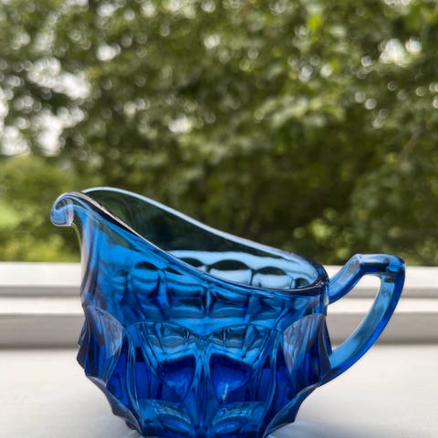 Vakkert koboltblått vintage «Aslak» fløtesett i pressglass fra Hadeland Gassverk.