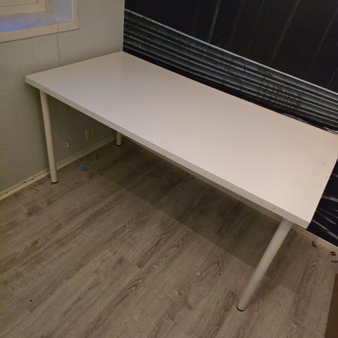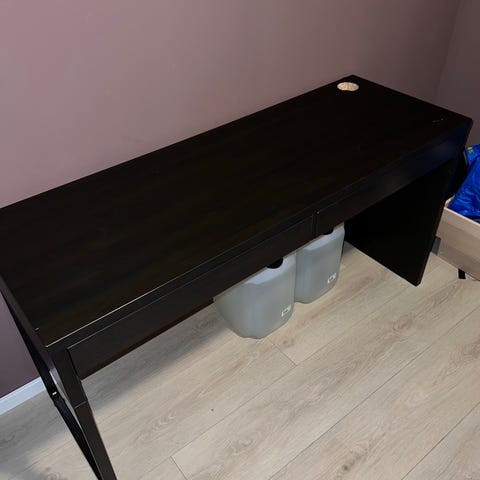 Skrivebord i heltre, mørk brun. Godt brukt og flere synlige merker. Har ikke forsøkt å fjerne flekkene, godt mulig det går an å få vekk (mest flekker etter sminke).