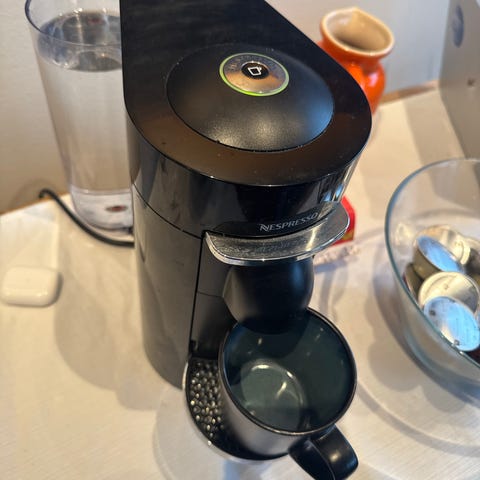 Nespresso kaffemaskin i svart farge. Maskinen er designet for bruk med Nespresso-kapsler og har et kompakt design som passer til kjøkkenbenken. Passer for hjemmebruk og lager espresso og andre kaffedrikker.