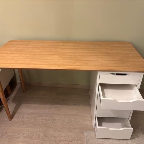 Skrivebord i tre med fire skuffer selges.