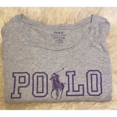 Ralph Lauren T-skjorte i blå farge med hvite striper. Størrelse XS for kvinner. Laget av bomullsmateriale.