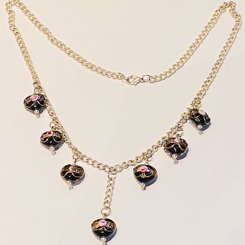 Selger et nydelig og unikt halskjede med et anheng i ekte dikroisk glass. Dette er et blikkfang av et smykke som skifter farge og glitrer avhengig av hvordan lyset treffer det. Fargene spenner fra dype rødfarger til skimrende kobber og gull.