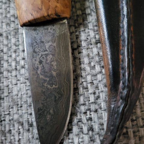 Forfinet brukskniv laget av oss - Tistedal knivmakeri. Skaft av stabilisert lønneknute, desert ironwood og sølvtinn med håndfilt mønster. Mønstersmidd blad fra Espen Norheim. Slire i rårandslær.