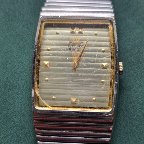 NB! De godt på bildene slik at du ser tilstanden på klokken, den er godt brukt. Den hakk og riper rundt omkring, og en flat skramme langs kassen som trolig også har vært borti kronen. Alt fungerer som det skal.