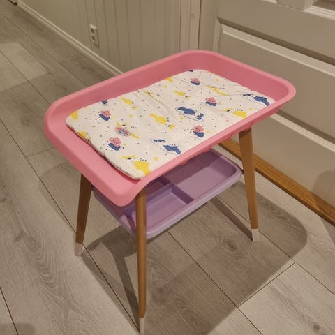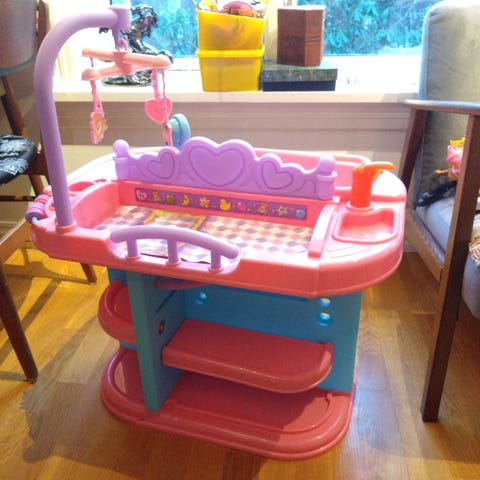 Stellestasjon til dukke med klesskap, badekar, stol og stellebord. Følger med masse artikler (såpe, kopp erc). Dukken følger ikke med.
