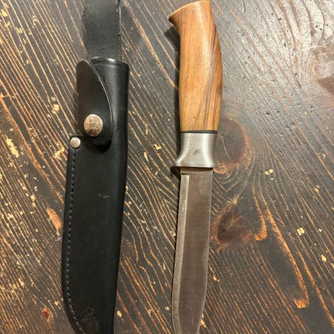 Kniven har normal bruksslitasje og riper i bladet (se bilder), men er hel og fullt brukbar. Passer godt som: