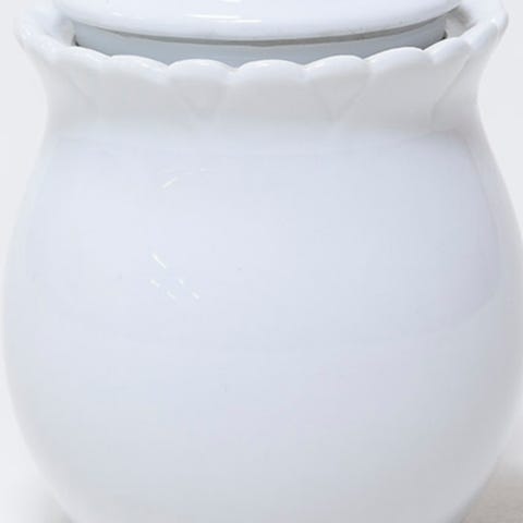 Gul Tupperware boks med hvit lokk.