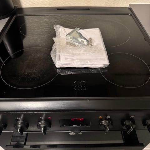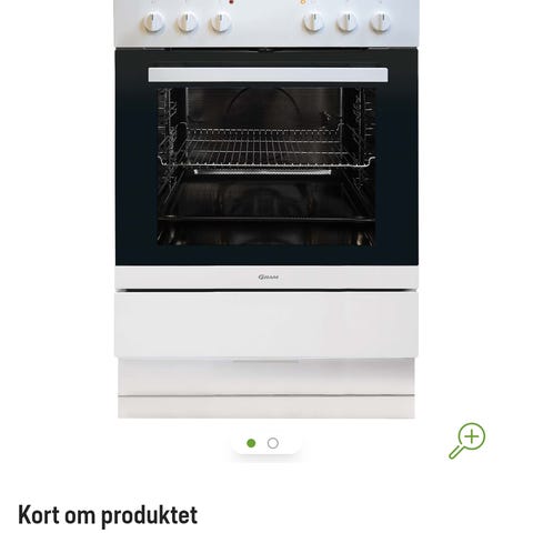 Gorenje keramisk komfyr med keramisk koketopp. Komfyren har flere betjeningsknapper for styring av varmeelementer og ovn. Farge: hvit.