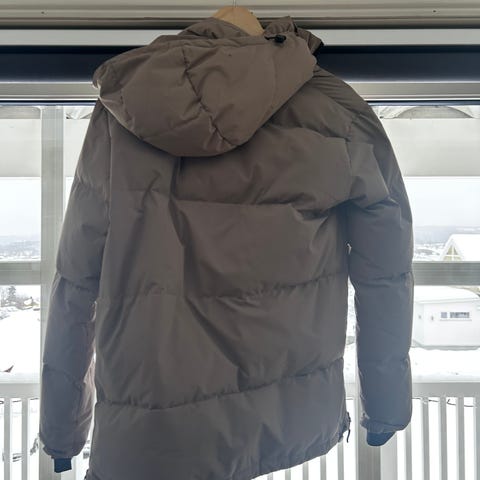 Annet yttertøy i beige farge, størrelse S for kvinner. Jakken har hette med pelskant og flere lommer, laget for utendørs bruk.