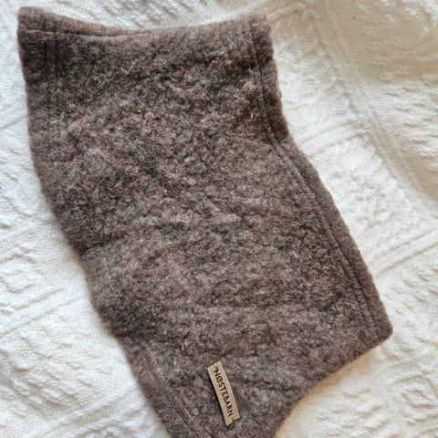 Dobbel tubehals. Mykt fôr i 70%ull og 30% silke med ullfrotte i 100% ull utenpå. Ekstra varm