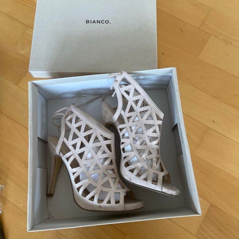Bianco hæler i størrelse 38. Skoene har flere tynne stropper og en lukking med spenne. Fargen er gullfarget med en blank finish. Hælene er moderate i høyde.