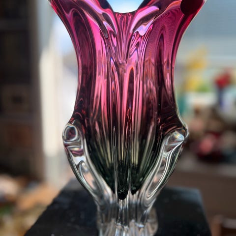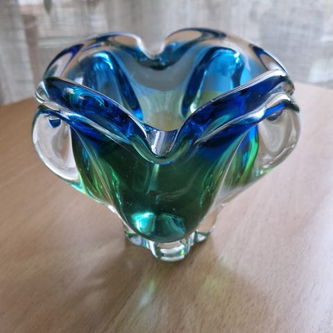Selger en stor, dekorativ glasskål på fot i klart, tykt pressglass.
