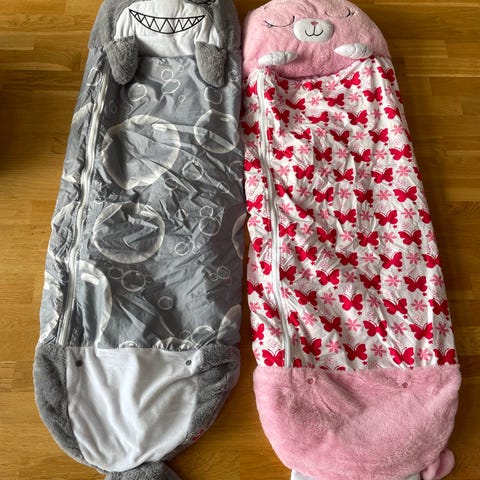 Jollyroom (tror jeg) sovepose for barn med flerfarget mønster og mykt materiale. Kan pakkes sammen til en rund puteform. Egnet for bruk innendørs.