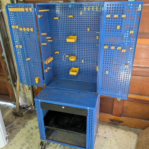 Har sammenleggbart toppbord som gir god arbeidsflate, samt skap med hylle for oppbevaring av verktøy.