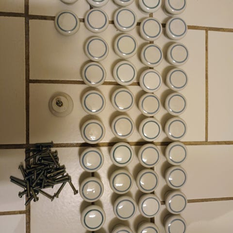 masse gamle knotter, store og små. disse har en blå metall hylse som plasseres i knotten . jeg viser eksempel på skruen som skal i på baksiden. skruene mangler så de må dere kjøpe selv( dette er slikt f.eks biltema har) det er 6 stk som mangler metall hylse. men om en ønsker kan hylsene fra de små f.eks puttes i de store som mangler. alle selges samlet for kr. 1000,- ( selges bare samle)