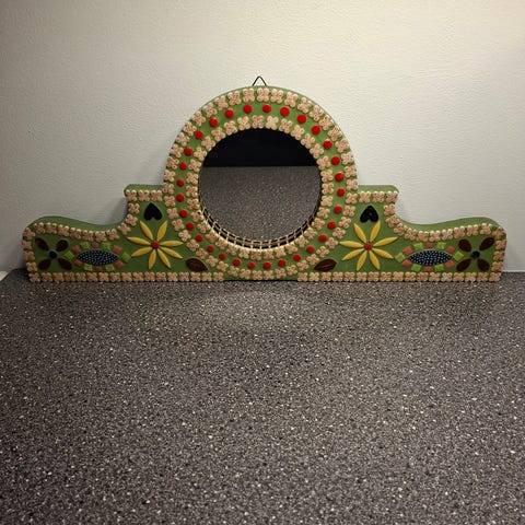 Stort speil på lengde 120 cm og høyde 105 cm, med to lamper. Med stikkontakt. Var i huset da vi kjøpte. Ser hel og fin ut. Fungerer sån den skal.