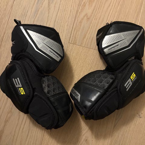 Selger et par godt brukte Bauer Supreme 3S albuebeskyttere. Disse har fungert utmerket og gir fortsatt god beskyttelse på isen, men har naturlige bruksmerker fra trening og kamper.