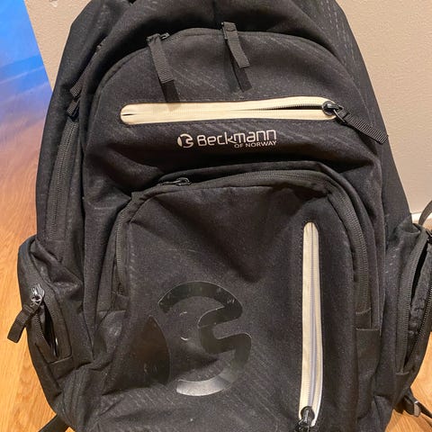 Pent brukt skolesekk for fra Beckmann. Blomstrete mønster utenpå og rosa inni.