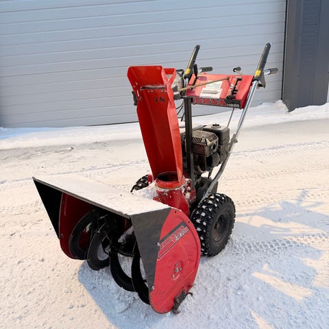 Honda HS55 snøfreser med rød farge og bensinmotor. Egnet for rydding av snø på innkjørsler og gangveier. Utstyrt med håndtak og kontrollpanel for enkel betjening.