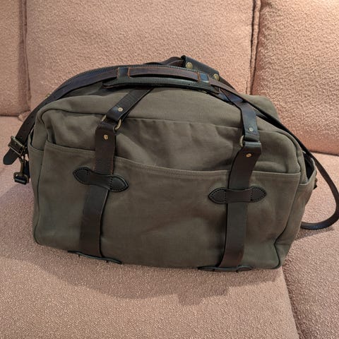 Filson veske i mørkeblå farge. Mye og godt brukt, men disse blir egentlig bare finere og finere ved brukt. Tjukk canavas.