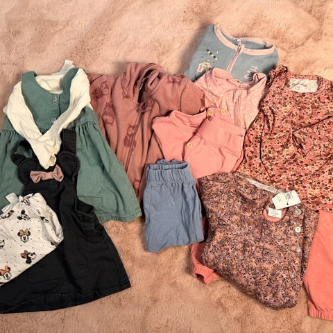 Selger 4 sett med bodyer og bukser til ei lita jente. Det er i størrelse 56, 62 og 68.