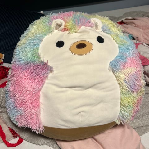 Squishmallows kosedyr med rund form og flerfarget design i rosa, lilla og blå toner. Laget av mykt materiale, egnet som leke eller pyntegjenstand for barn.