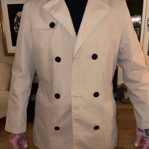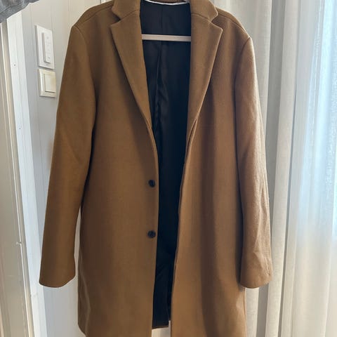Selger en lys brun/cognacfarget frakk fra Zara i Ull/Polyester. Kåpen er svært lite brukt og fremstår i god stand. Størrelse Large.