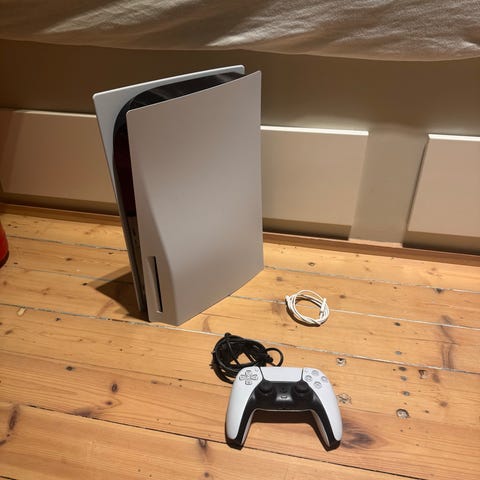 Pent brukt PS5 diskversjon selges sammen med 2 kontrollere, ladestasjon, trådløst Sony Pulse 3D-headset (PlayStation sitt eget, laget for 3D opplevelse av spillene) og 4 spill.
