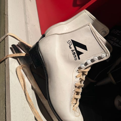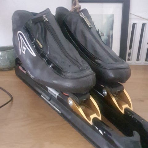 Viking klappskøyter i størrelse 36. Skøytene har svart og gul farge, er håndlaget og egnet for andre typer skøyting.