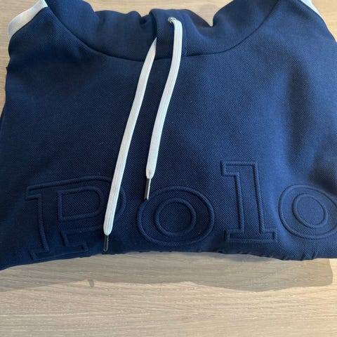 Ralph Lauren Polo hettegenser for herre i størrelse L. Genseren er beige og laget av polyester. Den har hette og lomme foran, og er designet for herrebruk.