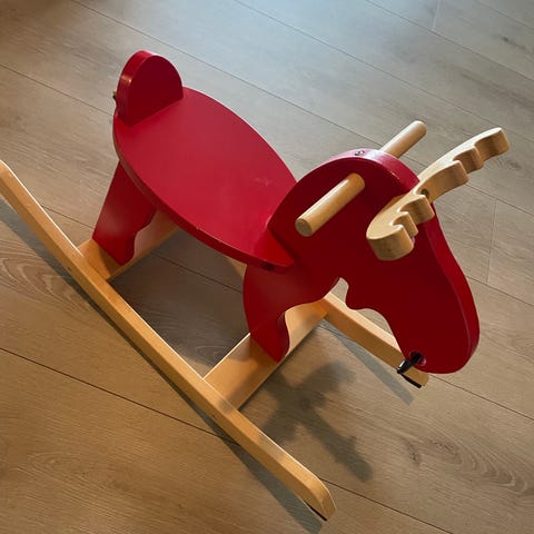 Gyngehest Laget av tremateriale, designet for lek og balanse.