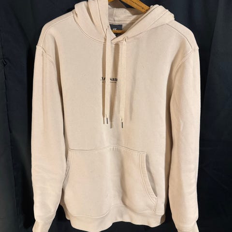 H&M Regular Fit hettegenser i beige farge, størrelse XS, laget av bomull. Genseren har hette med snor og et trykkmotiv på fronten som viser figurer fra the simpson. Er synlig brukt, men uten hull og flekker