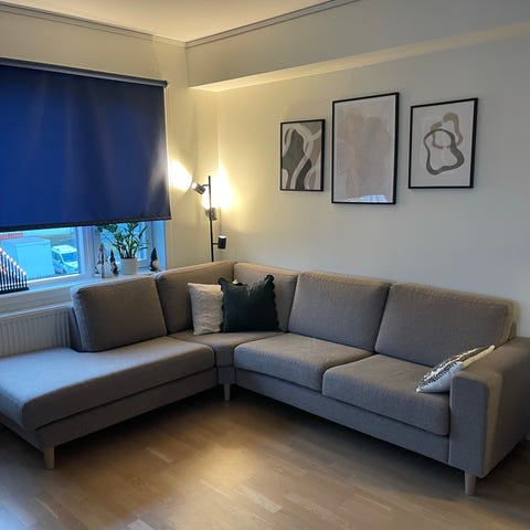 Hentes i Trondheim, er behjelpelig med å bære den ut av leiligheten. Sofaen er i 3 deler.