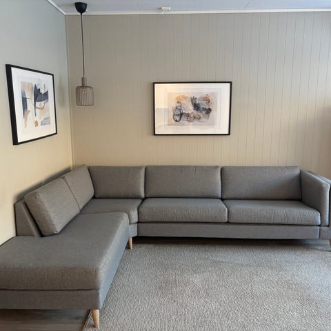 Godt, men veldig pent brukt 2,5 seter Hedda hjørnesofa med åpen ende venstre med hvitoljede eikeben. Følger også med en Hedda nakkestøtte som kan plasseres hvor man vil i sofaen. Tekstil og farge for både sofa og nakkepute er Lindt 1446-78 Dark Grey.