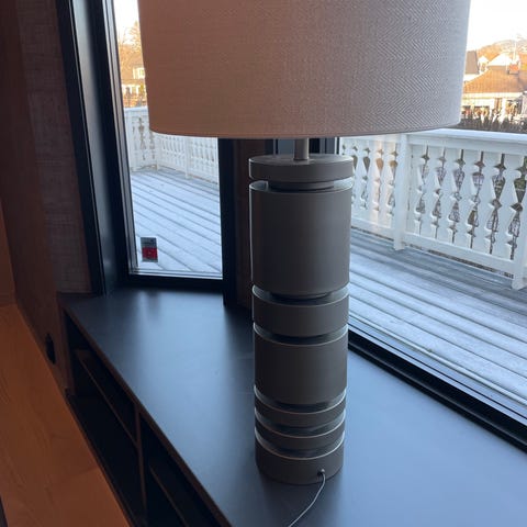 77 cm høy bordlampe i stål med sort skjerm. Høyde skjerm 47 cm og diameter 30 cm.