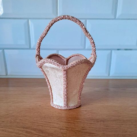 Dekorativ vintage flettet kurv/veske i tre. Håndlaget med flott patina og klassisk retro uttrykk. Passer fint som interiørdetalj, vedkurv, magasinholder eller til styling.
