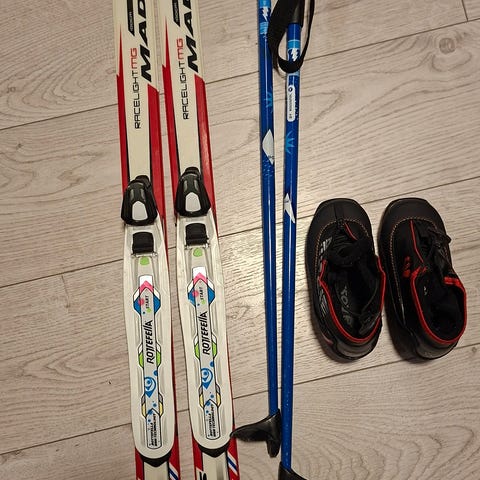 Pent brukte langrennski til barn inkludert staver til salgs. Skiene er 130 cm lange og stavene 100 cm.