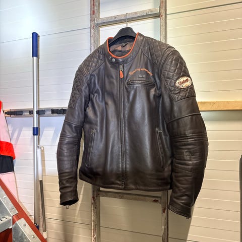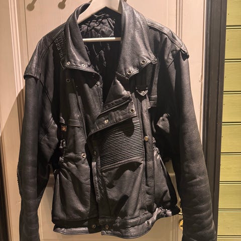 Frank Thomas skinnjakke for herre i størrelse EU 54. Jakken er svart med rødt innerfôr og har glidelåser og belte i livet. Materialet er skinn.
