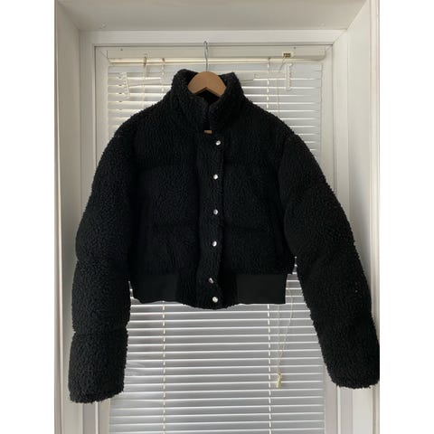 Stor og varm pufferjakke i brunt pels materiale. Str M. Aldri brukt!