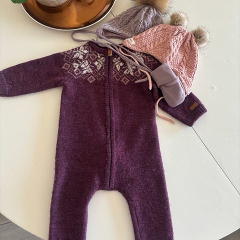 2 ullbodyer og 3 bukser i str. 68. Ingen bruksmerker bortsett fra noen nupper på den hvite og lilla buksen.