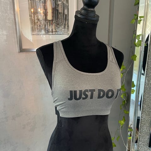 Nike sportsbh i størrelse XS. Toppen har grå og svart farge og er laget med Dri-FIT materiale som bidrar til fukttransport.