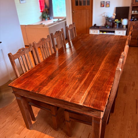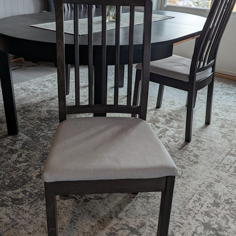 Fire spisestoler selges samlet - godt brukt, men fortsatt mye bruk igjen.