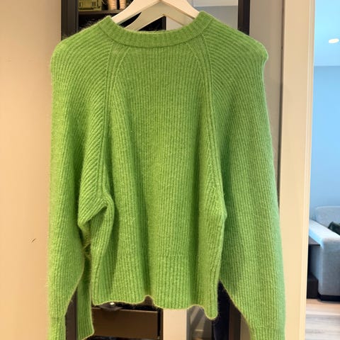 Brukt 2 ganger Urban Pioneers ull/mohair genser. Liten puff på skulder og kort arm. Fremstår som ny. Farge, Lime gul. Str S