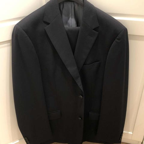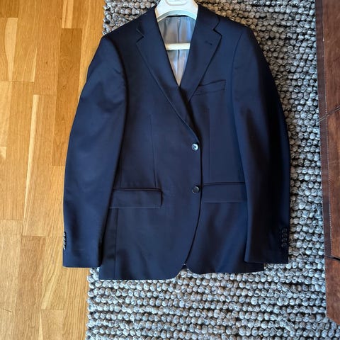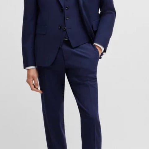 Hugo dress for menn i størrelse 50, laget av ull. Jakken er marineblå og har en klassisk design. Materialblandingen består hovedsakelig av ull med tillegg av polyester og elastan for komfort og holdbarhet.