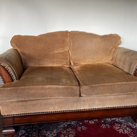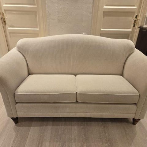 Toseters sofa fra cirka 1950/1960 med gull/sennep farge i velour. Sofaen har puter i sete og rygg, samt avrundede armlener. Passer til stue eller oppholdsrom. Sofaen fikk ny velour for noen få år siden (gjort av profesjonelle håndverkere)