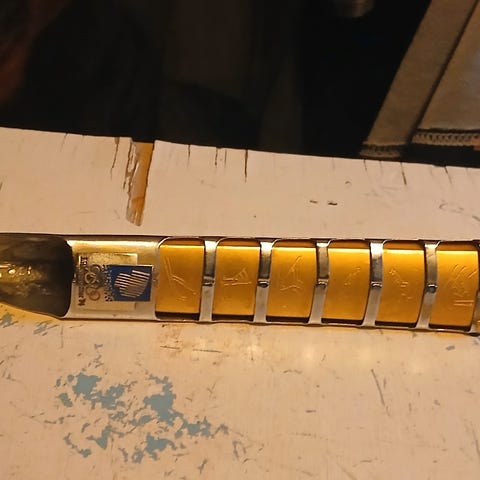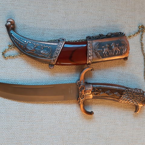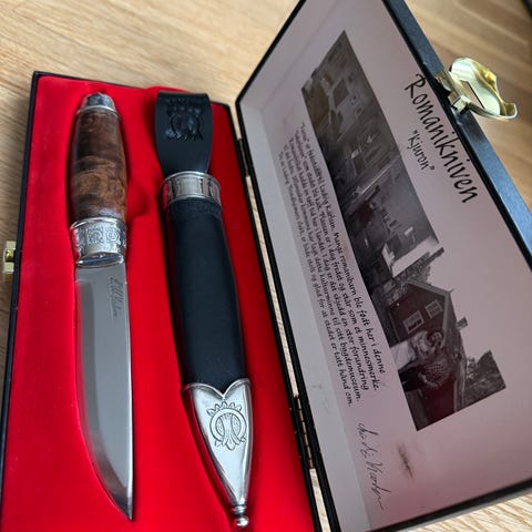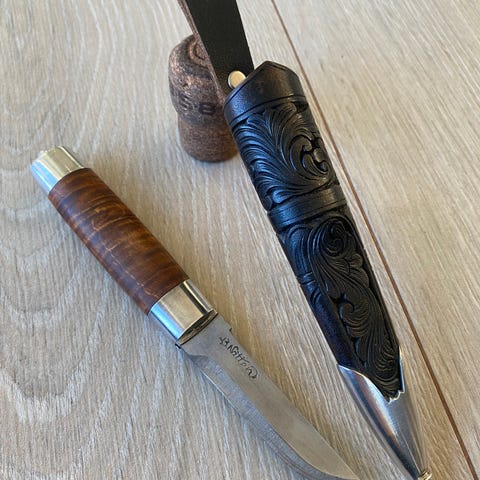 Kniven har detaljer i metall med graveringer, og et håndtak som gir godt grep.