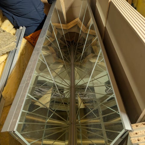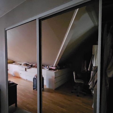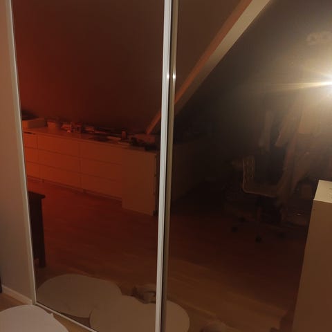 Solide speil skyvedører med hvit ramme fra Langbo, måler 240 cm i høyde og 50 og 60 cm i bredde. Egnet for veggmontering og interiørbruk.